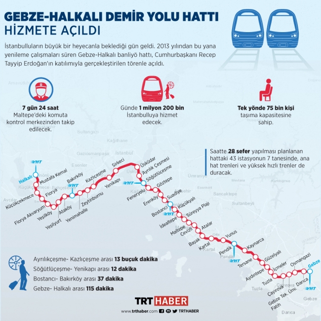 İstanbulluların büyük bir heyecanla beklediği gün geldi. Gebze-Halkalı banliyö hattı, bugün Cumhurbaşkanı Recep Tayyip Erdoğan'ın katılımıyla gerçekleştirilecek törenle açılacak.