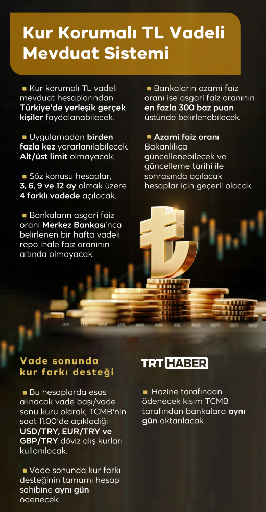 Hazine ve Maliye Bakanlığı, kur korumalı TL vadeli mevduat ve katılma hesaplarından Türkiye'de yerleşik gerçek kişilerin faydalanabileceğini, uygulamadan birden fazla kez yararlanılmasının mümkün olacağını ve alt/üst limitin olmayacağını duyurdu.