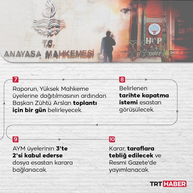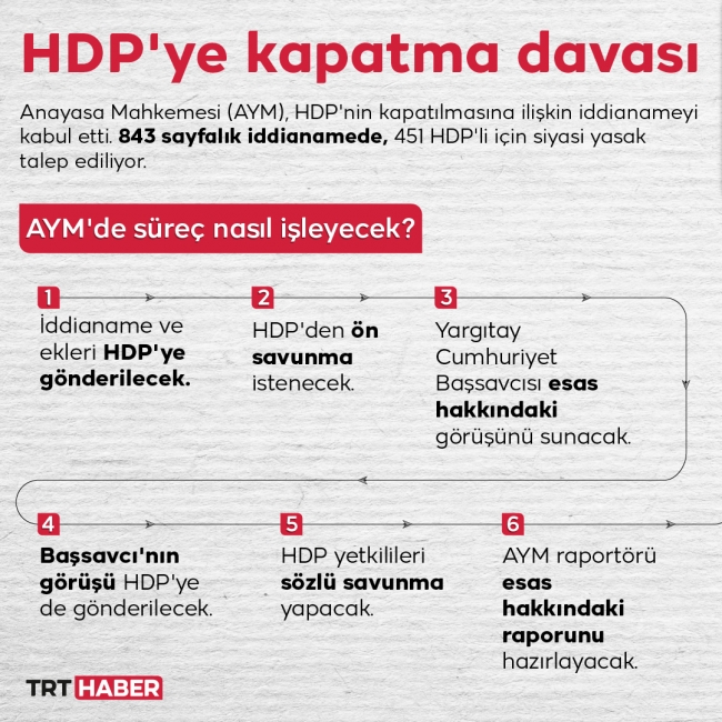 Anayasa Mahkemesi (AYM), HDP'nin kapatılmasına ilişkin iddianameyi kabul etti. Yargıtay Cumhuriyet Başsavcılığı'nın hazırladığı 843 iddianamede 451 HDP'linin de siyasetten yasaklanması talep ediliyor.