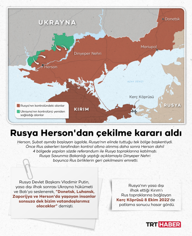 Rusya, Herson'dan geri çekilme kararı aldı. Herson, Ukrayna'nın tanımadığı bir referandum sonrası Rusya tarafından ilhak edilen dört bölgeden biriydi. Bu hamlenin Rusya Federasyonu için taşıdığı anlam önemli. Ukrayna-Rusya savaşında gelinen son nokta ne gösteriyor? Detaylar haberimizde.