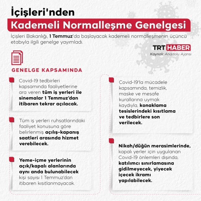 Türkiye 1 Temmuz'da kademeli normalleşme döneminin üçüncü etabına geçiyor. Tedbirler kapsamında faaliyetine ara veren tüm iş yerleri yeniden açılıyor.