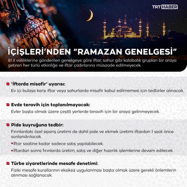 İçişleri'nin ramazan genelgesine göre iftar ve sahur gibi kalabalık grupları bir araya getiren her türlü etkinliğe ve iftar çadırlarına müsaade edilmeyecek. Fırınlardaki özel sipariş de dahil pide ve ekmek üretimi iftardan 1 saat önce tamamlanacak.