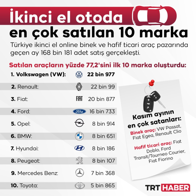Geçen ay Türkiye ikinci el online araç pazarında en çok tercih edilen markalar sırasıyla Volkswagen, Renault ve Fiat oldu. En çok tercih edilen binek otomobil modelleri Passat, Egea ve Clio, hafif ticari modellerde ise Doblo, Ford Transit/Tourneo Courier ve Fiorino olarak belirlendi.