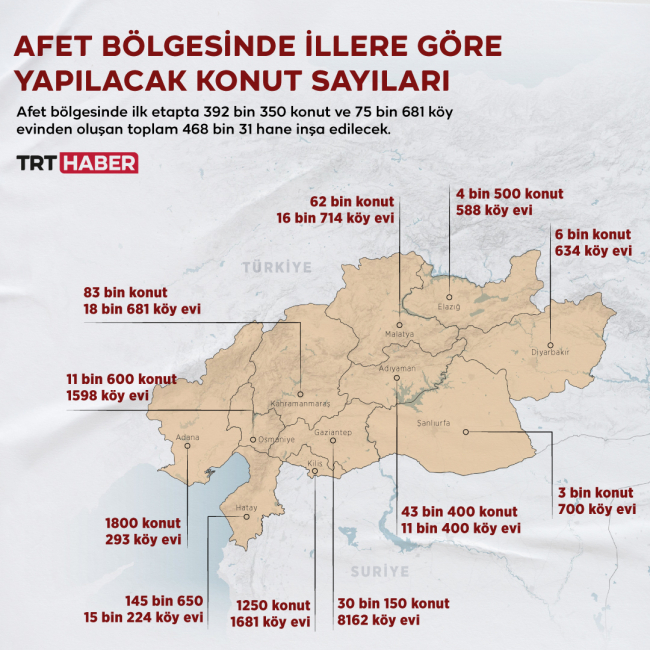 392 bin 350 konut ve 75 bin 681 köy evi... İşte deprem bölgesindeki illere göre yapılacak konut sayıları.