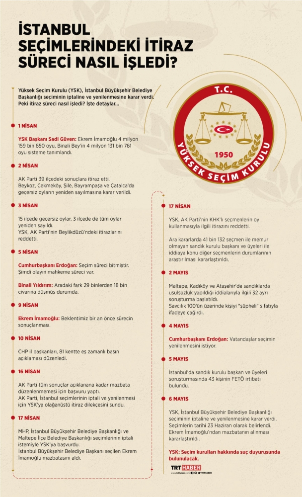 Yüksek Seçim Kurulunun (YSK), İstanbul Büyükşehir Belediye Başkanlığı seçiminin iptaline ve yenilenmesine karar verdi. Peki itiraz süreci nasıl işledi? İşte detaylar…