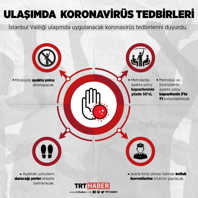 İstanbul Valiliği koronavirüs tedbirleri kapsamında alınan yeni kararları açıkladı. Tramvayda yüzde 50, metrobüste ayakta yolcu kapasitesinin 3'te 1'i kadar yolcu taşınacak.