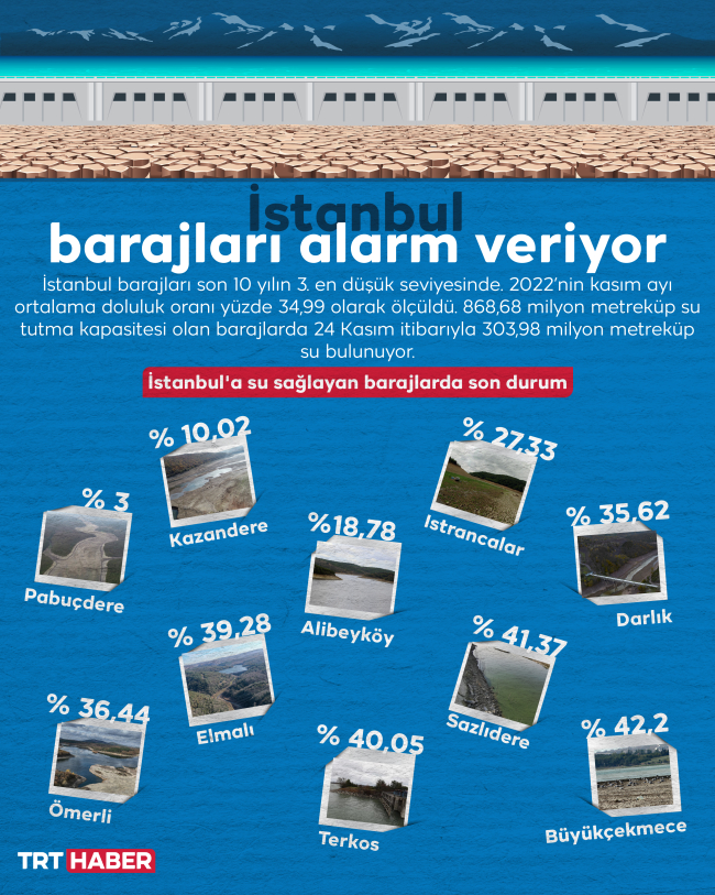İstanbul'un barajlarında doluluk oranı yüzde 35'in altına inerek, alarm vermeye başladı. İSKİ verilerine göre İstanbul'un barajlarındaki doluluk oranı yüzde 34.99 olarak ölçüldü. Bu rakam, son 10 yıl içindeki en düşük 3 oran arasına girdi.