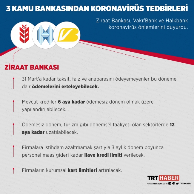 Ziraat Bankası, Ziraat Katılım Bankası, VakıfBank, Vakıf Katılım ve Halkbank koronavirüs önlemlerini duyurdu.