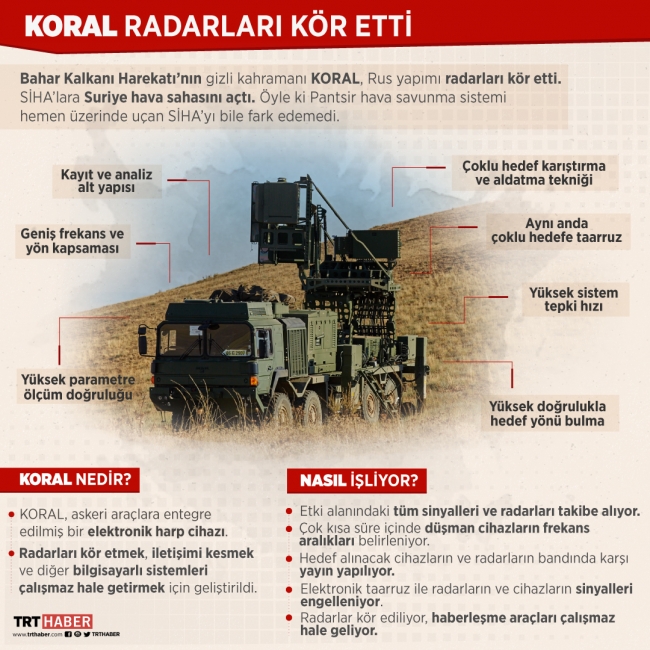 Elektronik Harp Sistemi Koral, İdlib'de Mehmetçiğin yürüttüğü Bahar Kalkanı Harekatında önemli rol oynuyor. Koral, hedefin haberleşmesini keserek, elektronik olarak kör ediyor.