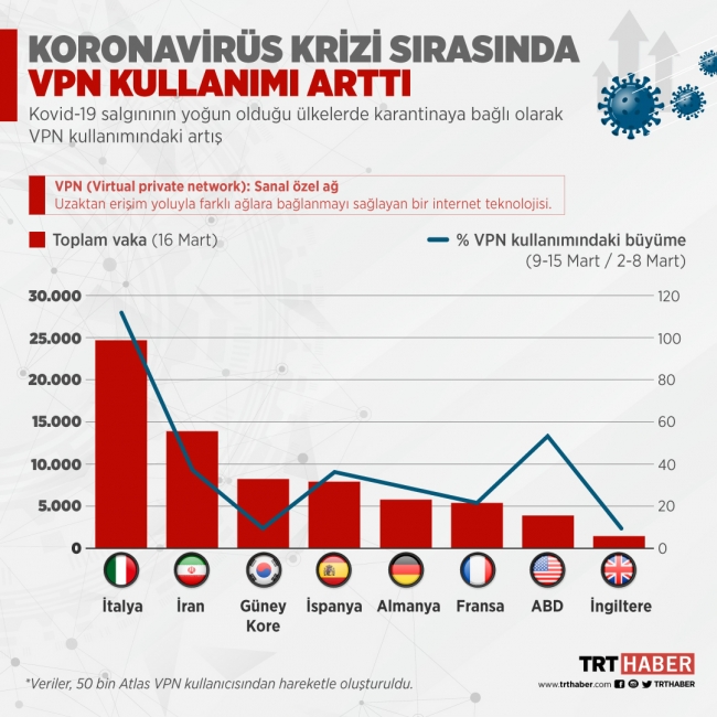 Koronavirüs salgınıyla mücadele için alınan önlemler kapsamında, çoğu kişi evinden çıkmamaya çalışıyor. Evden çalışma da internet kullanımı da arttı. Bu durum, özellikle salgının yoğun görüldüğü bölgelerdeki VPN kullanımında büyük artışa neden oldu.