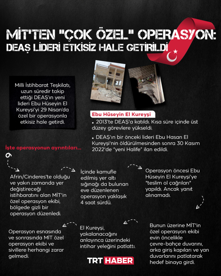 Milli İstihbarat Teşkilatı (MİT) tarafından Suriye'nin kuzeyinde düzenlenen operasyonla etkisiz hale getirilen terör örgütü DEAŞ'ın sözde lideri Ebu Hüseyin El-Kureyşi'nin, MİT'ten saklanmak için Miske köyündeki villadan aylardır dışarı çıkmadığı öğrenildi.