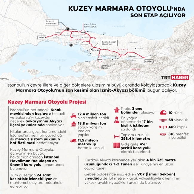 İstanbul'un çevre illere ve diğer bölgelere ulaşımını büyük oranda kolaylaştıracak Kuzey Marmara Otoyolu'nun son kesimi olan İzmit-Akyazı bölümü, bugün açılıyor.