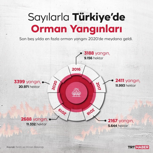 2020, orman yangınları açısından talihsiz bir yıldı. Yıl boyunca toplam 3 bin 399 yangın çıktı, 20 bin 971 hektar alan zarar gördü. Yangınlarda insan faktörü ilk sırada yer aldı.