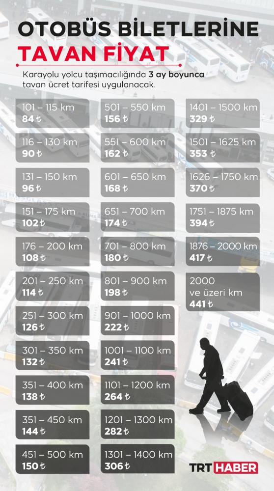 Yolcu bilet ücretlerinde fahiş fiyat uygulamalarının önüne geçilmesi amacıyla, karayolu yolcu taşımacılığı alanında 3 ay süreyle tavan ücret tarifesi uygulanacak.