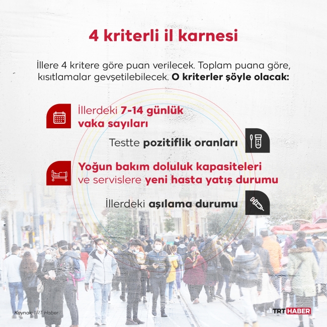 Türkiye 1 Mart itibarıyla kademeli normalleşme sürecine girecek. İller 4 kriter çerçevesinde puanlandırılacak. Bu puana göre risk durumları renklerle ifade edilecek. İllerle ilgili 'yerinde karar' süreci başlayacak.