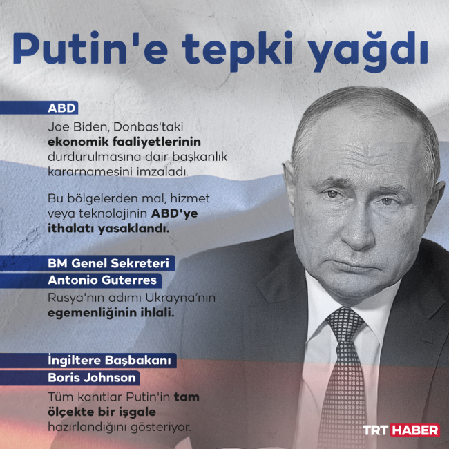 Rusya Devlet Başkanı Putin'in Donetsk ve Luhansk'ı tanıma kararına dünyadan tepkiler peş peşe geldi. Çok sayıda ülke ve devlet başkanları Rusya'nın bu adımını egemenlik ihlali olarak değerlendirdi.