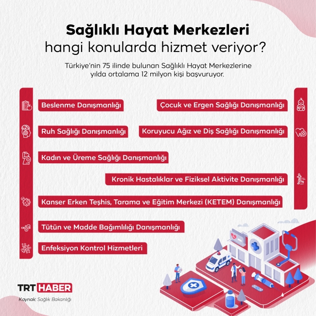 Beslenmeden ruh sağlığına, kronik hastalıklardan diş problemlerine pek çok konuda danışmanlık sunan Sağlıklı Hayat Merkezleri, 75 ilde hizmet veriyor. Türkiye genelindeki 200’ü aşkın merkezden yılda 12 milyon kişi faydalanıyor.