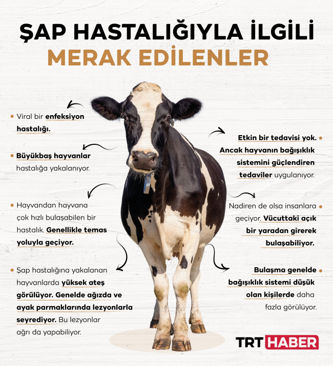 Büyükbaş hayvanlarda görülen şap hastalığı, viral bir enfeksiyon. Hayvanlar arasında temasla bulaşan şap hastalığı nadiren de olsa insanlara geçebiliyor.