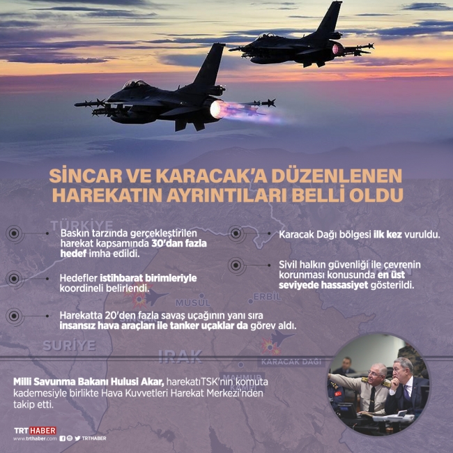 Irak’ın kuzeyindeki Sincar ve Karacak Dağı bölgelerine hava harekatı düzenlendi. Harekatta 30’dan fazla hedef imha edildi.