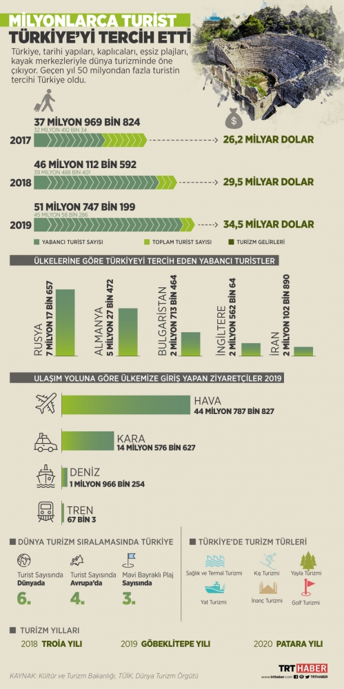 Türkiye, tarihi yapıları, kaplıcaları, eşsiz plajları, kayak merkezleriyle dünya turizminde öne çıkıyor. Geçen yıl 50 milyondan fazla turistin tercihi Türkiye oldu.