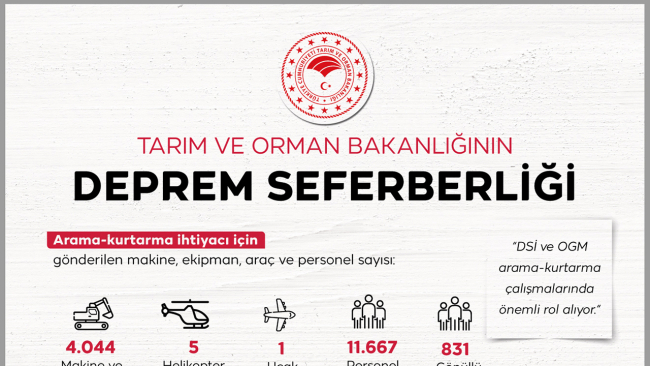11 bin 677 personel, 5 helikopter, binlerce makine ve ekipman... Tarım ve Orman Bakanlığı bütün imkanlarını deprem bölgesi için seferber etti.