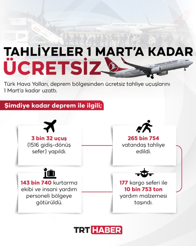 Türk Hava Yolları, deprem bölgesinden ücretsiz tahliye uçuşlarını 1 Mart'a kadar uzattı.