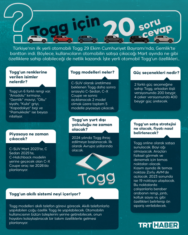 Türkiye'nin ilk yerli otomobili Togg 29 Ekim Cumhuriyet Bayramı'nda, Gemlik'te görkemli bir tören ile banttan indi. Otomobili ilk kullanan Cumhurbaşkanı Erdoğan oldu. Böylece, kullanıcıların otomobilin satışa çıkacağı Mart ayında ne gibi özelliklere sahip olabileceği de netlik kazandı. İşte yerli otomobil Togg'un özellikleri...