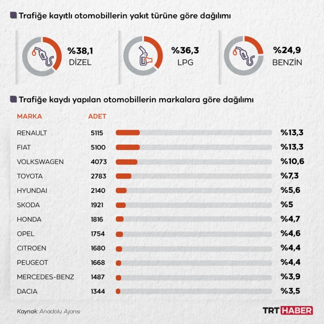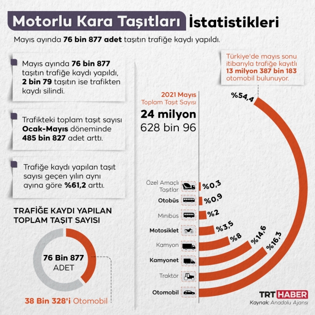 Ocak-mayıs döneminde 502 bin 973 taşıtın trafiğe kaydı yapılırken, 17 bin 146 aracın kaydı silindi. Böylece trafikteki toplam taşıt sayısı 485 bin 827 arttı.