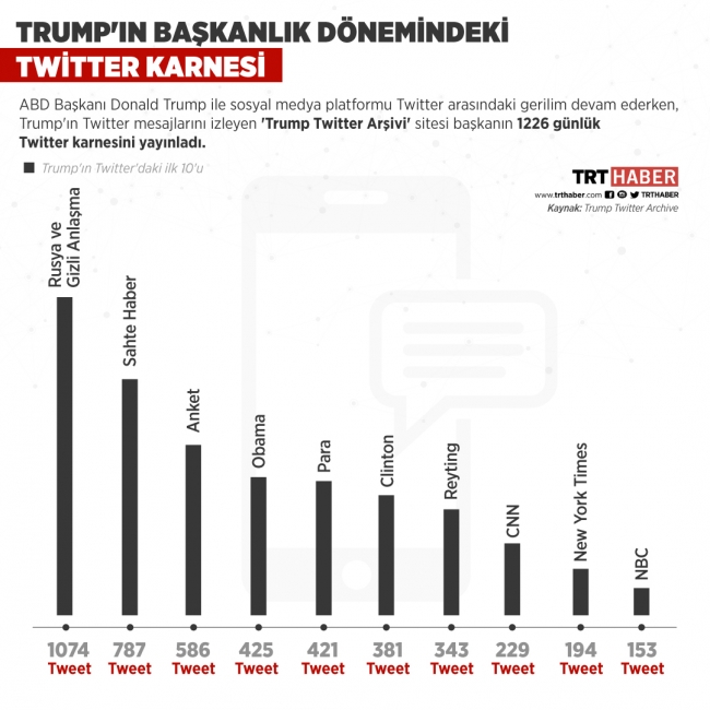 ABD Başkanı Donald Trump ile sosyal medya platformu Twitter arasındaki gerilim devam ederken, Trump'ın Twitter mesajlarını izleyen 'Trump Twitter Arşivi' sitesi, Başkan'ın bin 226 günlük Twitter karnesini yayınladı.