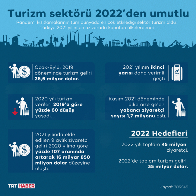 Koronavirüs salgını nedeniyle hayatımıza giren kısıtlamalar en çok turizm sektörünü etkiledi. Türkiye birçok ülkeye nazaran 2021'i en az zararla kapatan ülkelerden. Turizm sektörü 2022'den daha da umutlu...