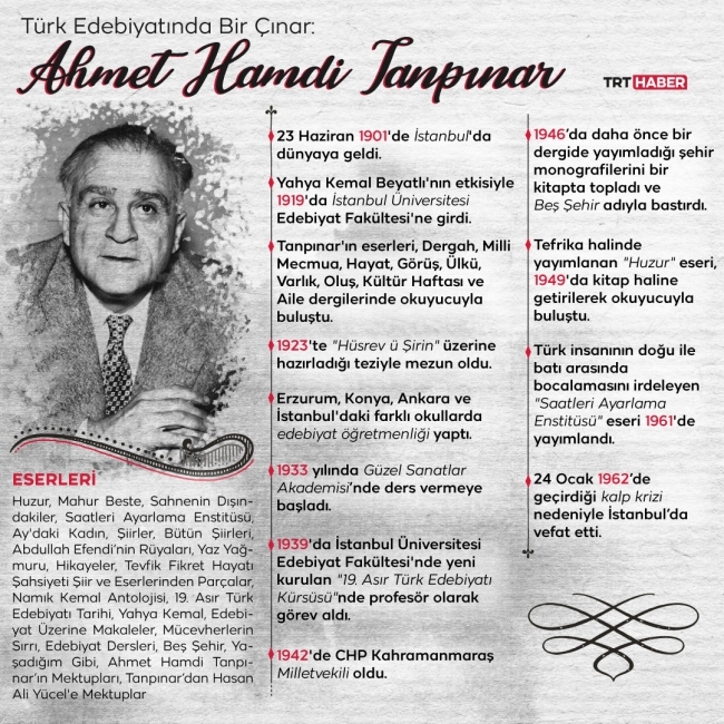 Türk edebiyatının en önemli isimlerinden biri olan ve "Huzur", "Saatleri Ayarlama Enstitüsü" ve "Beş Şehir" eserleriyle tanınan Ahmet Hamdi Tanpınar, vefatının 59. yıl dönümünde yad ediliyor.