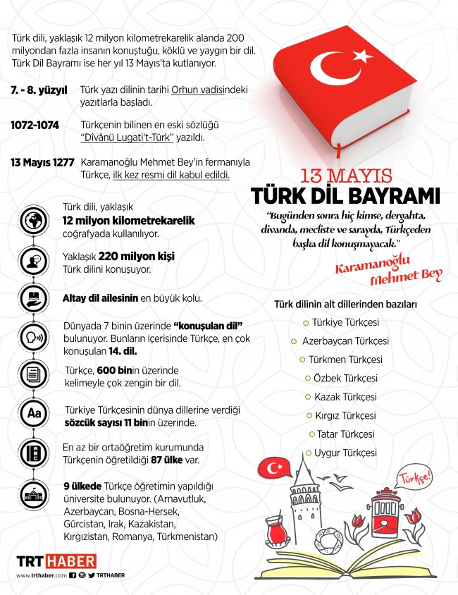 Türk dili, yaklaşık 12 milyon kilometrekarelik alanda 200 milyondan fazla insanın konuştuğu, köklü ve yaygın bir dil. Türk Dil Bayramı ise her yıl 13 Mayıs’ta kutlanıyor.