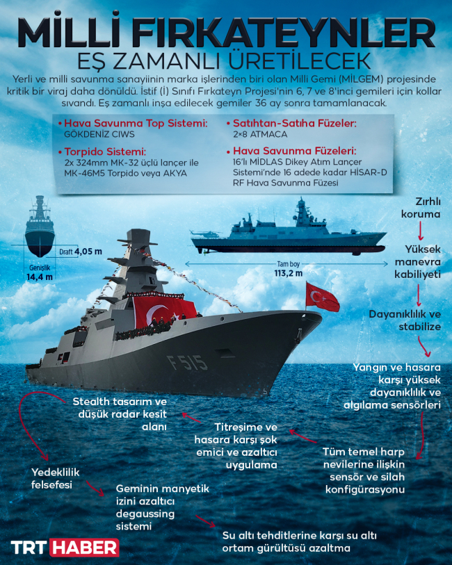 Türk savunma sanayii, özel sektör tersanelerinin üretim gücünden yararlanarak 3 milli fırkateyni eş zamanlı üretip, Deniz Kuvvetleri Komutanlığı'nın hizmetine sunacak.