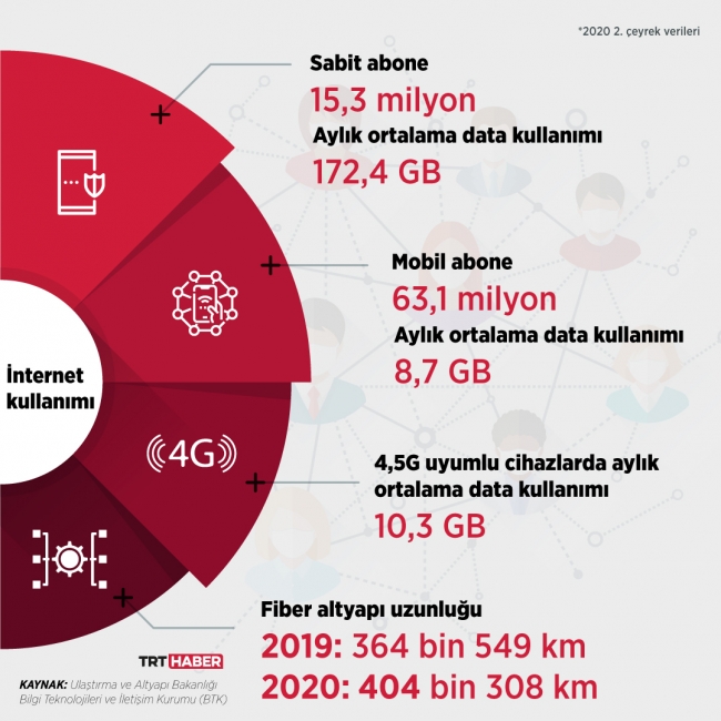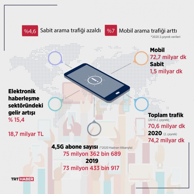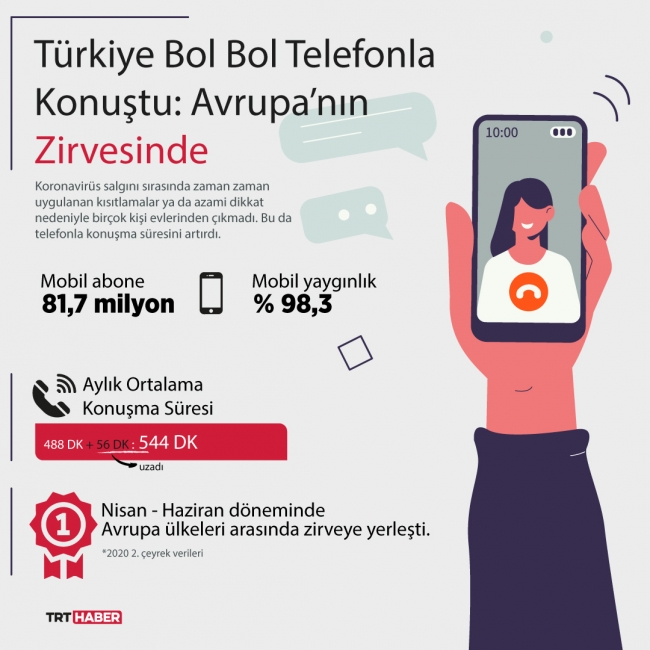 Ocak-mart döneminde aylık ortalama 488 dakika olan mobil cihazlardan konuşma süresi, salgının etkili olduğu nisan-haziran döneminde aylık ortalama 544 dakikaya yükseldi ve Türkiye bu konuda Avrupa'nın zirvesinde yer aldı.