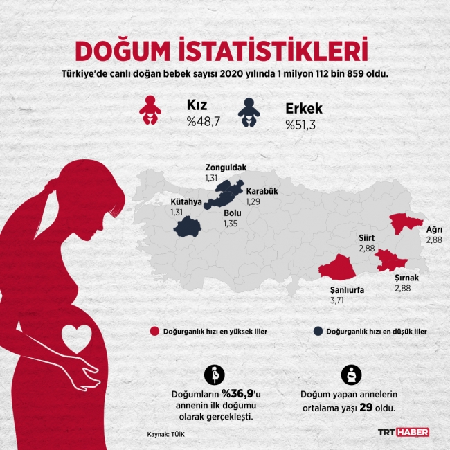 Türkiye'de canlı doğan bebek sayısı 2020 yılında 1 milyon 112 bin 859 oldu. Canlı doğan bebeklerin yüzde 51,3'ü erkek, yüzde 48,7'si kız oldu.