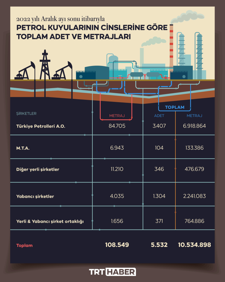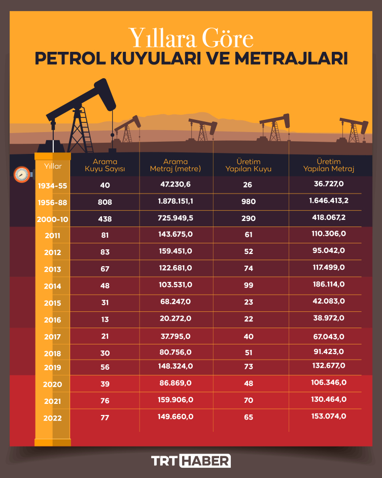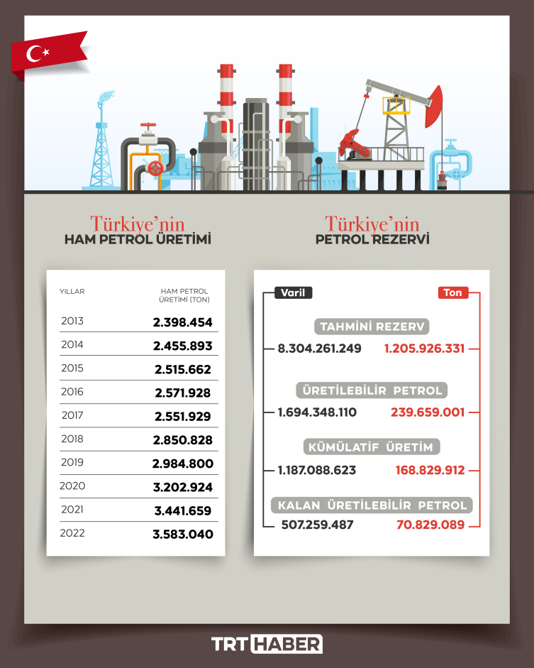 Türkiye’nin 2022 sonu itibariyle yeraltında 1 milyar 205 milyon ton petrolü bulunuyor. Bunun 239 milyon tonu üretilebilir durumda. Kümülatif üretim ise 168 milyon tonu geçti. 1999 yılında 2,9 milyon ton olan yıllık ham petrol üretimi, 2022 sonunda 3 milyon 583 bin tona ulaştı.