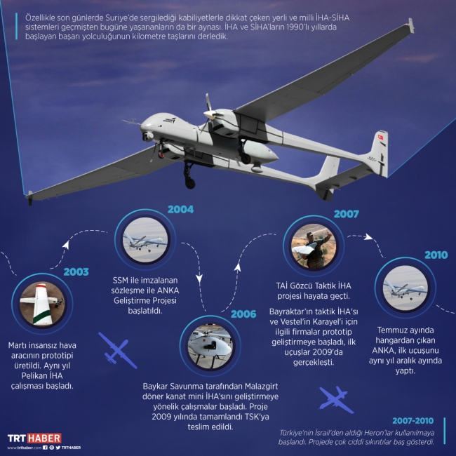 Özellikle son günlerde Suriye'de sergilediği kabiliyetlerle dikkat çeken yerli ve milli İHA-SİHA sistemleri geçmişten bugüne yaşananların da bir aynası. İHA ve SİHA'ların 1990'lı yıllarda başlayan başarı yolculuğunun kilometre taşlarını derledik.