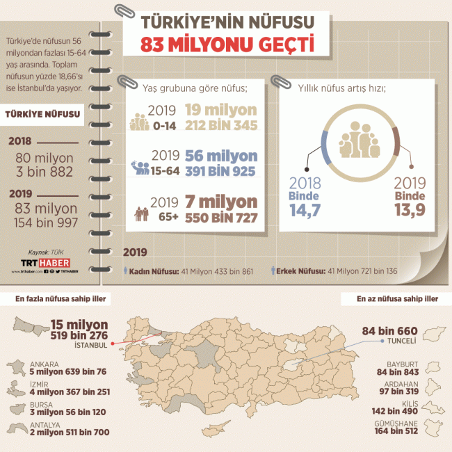 Türkiye'nin nüfusu, 2019'da bir önceki yıla göre 1 milyon 151 bin 115 kişi artarak 83 milyon 154 bin 997 kişi oldu.