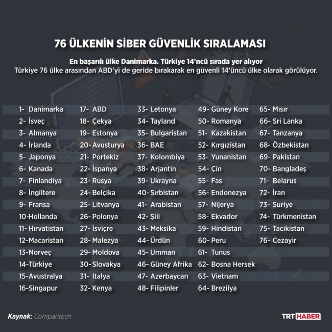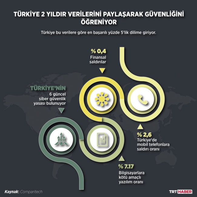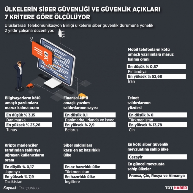 Uluslararası Telekomünikasyon Birliği, 2 yıldır ülkelerin siber güvenlik karnelerini hazırlıyor. Türkiye, verilerini paylaşan 76 ülke arasında en başarılı yüzde 5'lik dilimde yer alıyor.