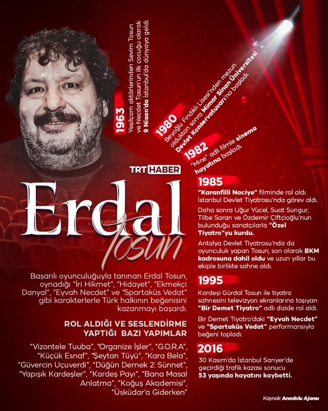 Başarılı oyunculuğuyla tanınan Erdal Tosun, oynadığı “İri Hikmet”, “Hidayet”, “Ekmekçi Danyal”, “Eyvah Necdet” ve “Spartaküs Vedat” gibi karakterlerle Türk halkının beğenisini kazanmayı başardı.
