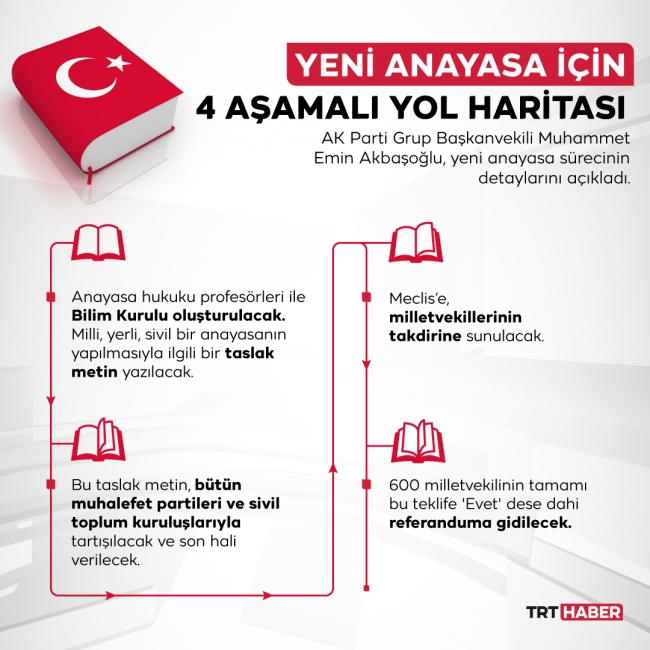 AK Parti Grup Başkanvekili Akbaşoğlu, yeni anayasa çalışmaları kapsamında dört aşamalı bir yol haritası üzerinde çalışıldığını açıkladı. İlk olarak "Yeni Anayasa Bilim Kurulu" oluşturulacak. Son aşamaya gelindiğinde ise referandumla onaya sunulacak.