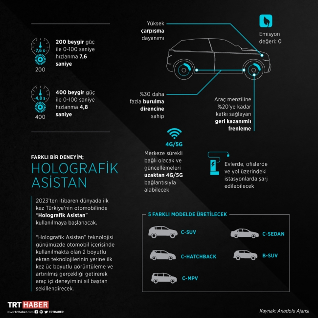 Türkiye'nin otomobili tanıtıldı. Tamamen elektrikli yerli otomobil geniş iç hacmi, holografik asistan, 300+ ve 500+ kilometre menzil opsiyonları ile geleceğe göz kırpıyor.