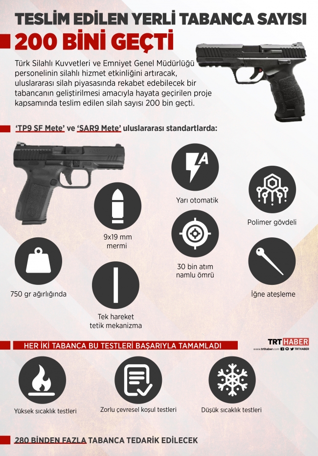 Son yıllarda yerli ve milli silahlar konusunda çok önemli imkan ve kabiliyetlere ulaşan Türkiye, ‘Özgün Yerli Tabanca Geliştirilmesi Projesi’nde de hızla ilerliyor. Özellikleriyle dikkat çeken milli tabancada teslim edilen silah sayısı 200 bini aştı.