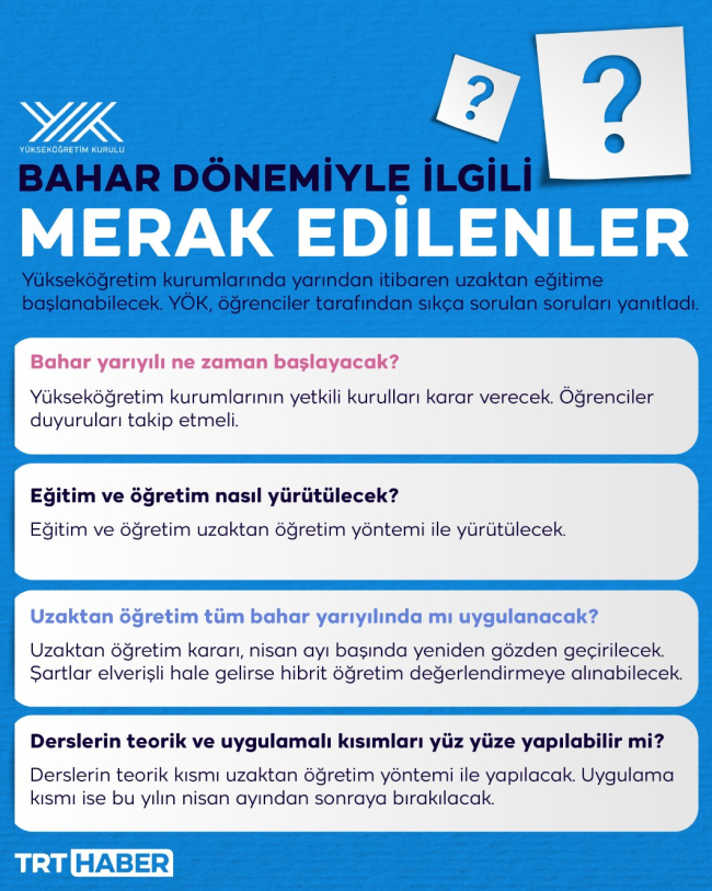 Yükseköğretim Kurulu (YÖK), üniversitelerde 2022-2023 bahar yarıyılı eğitim ve öğretimine ilişkin sıkça sorulan 16 soruyu yanıtladı.