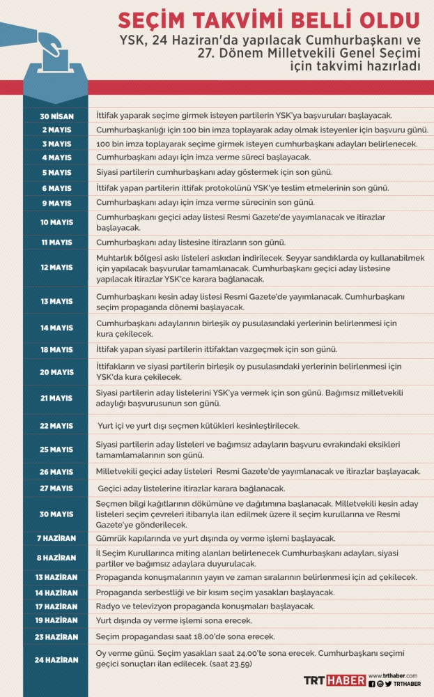 YSK, 24 Haziran'da yapılacak Cumhurbaşkanı ve 27. Dönem Milletvekili Genel Seçimi için takvimi hazırladı.