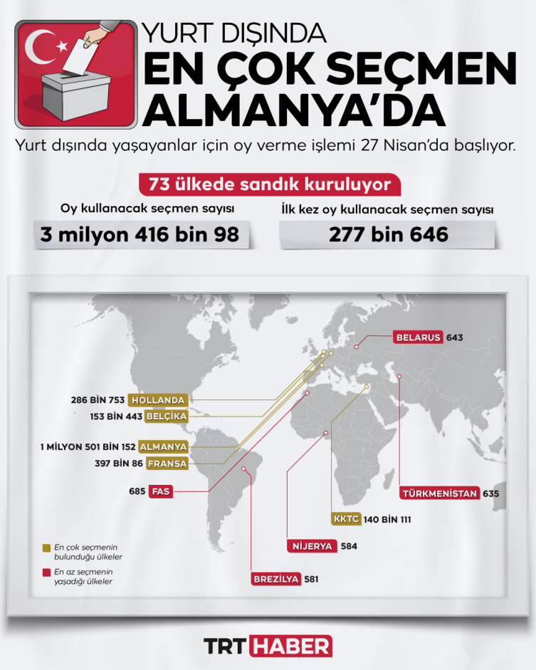 Gurbetçiler, 14 Mayıs seçimleri için yarın sandık başına gitmeye başlayacak. Almanya'da 1 milyon 501 bin 152 seçmen, Brezilya'da ise 581 seçmen bulunuyor. Yurt dışı seçmen kütüğüne kayıtlı seçmenler, tatil günleri dahil 24 saat süreyle oy kullanılabilecek.