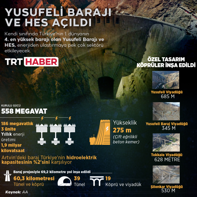 Yükseklik bakımından Türkiye'de birinci, dünyada 5'inci sırada yer alan Yusufeli Barajı ve HES, Cumhurbaşkanı Erdoğan'ın katıldığı törenle bugün su tutmaya başladı. Baraj, yıllık ortalama 1,9 milyar kilovatsaatlik elektrik üretimiyle ekonomiye 5 milyar liralık katkıda bulunacak.