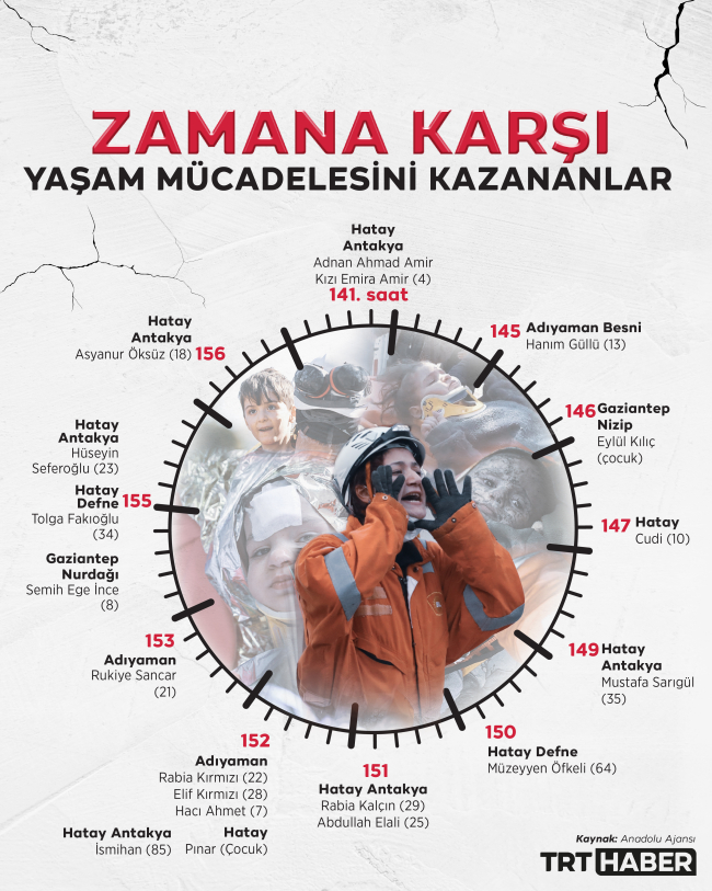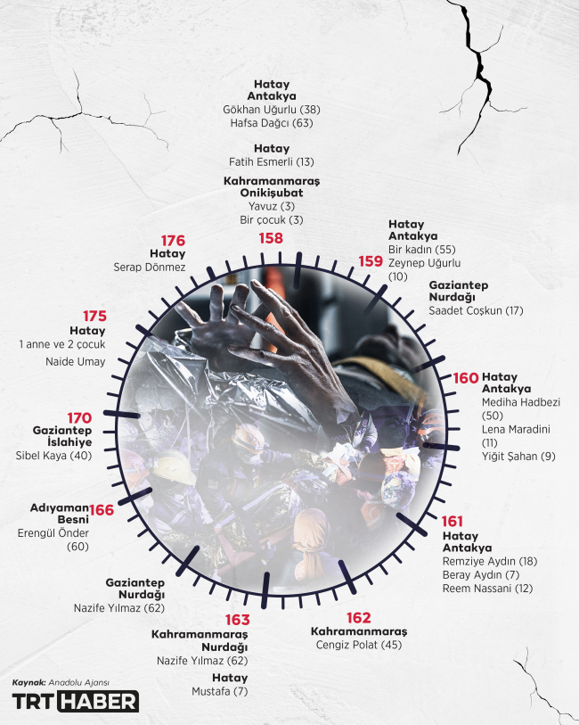 "Asrın felaketi" olarak nitelenen, Kahramanmaraş merkezli, 10 ili etkileyen 7,7 ve 7,6 büyüklüğündeki depremlerin ardından geçen 141'inci ve 163'üncü saatler arasında en az 41 kişi enkaz altından sağ çıkarıldı.