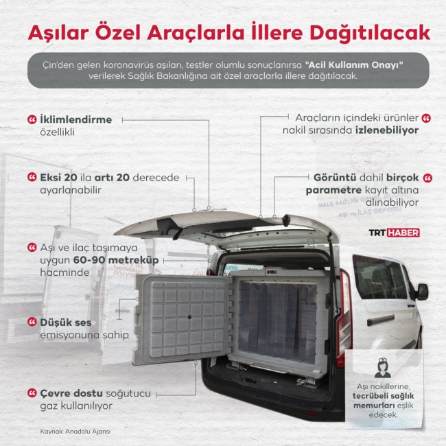 Aşılar, illere ulaştırılmasının ardından soğuk hava depolarında koruma altına alınacak ve bölge ihtiyaçlarına uygun 1, 5, 8 ve 13 metreküp hacimlerinde frigorifik araçlarla şehrin tüm noktalarına dağıtılacak.