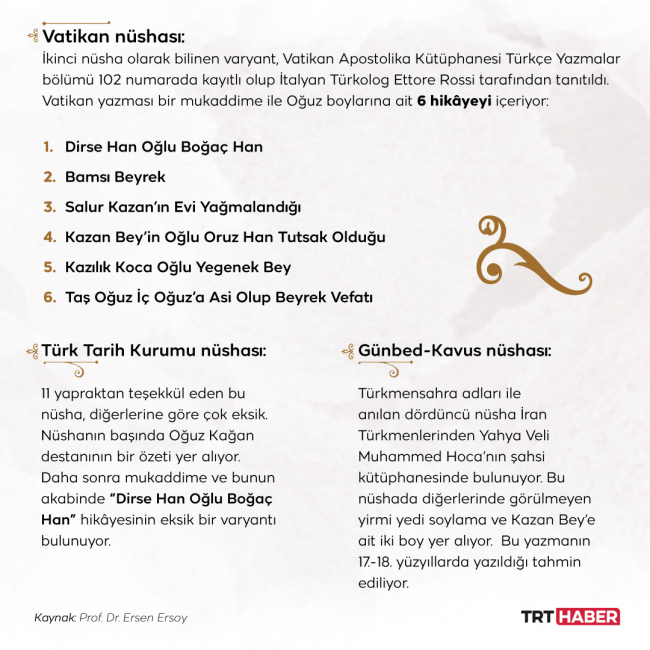 Yakın zamana kadar Dede Korkut Hikâyelerinin dört nüshası biliniyordu. Bunlar Dresden, Vatikan, Türk Tarih Kurumu ve Günbed-Kavus nüshaları olarak adlandırılıyor. Bu nüshalar biline dururken bilim dünyasını heyecanlandıran bir gelişme yaşandı.